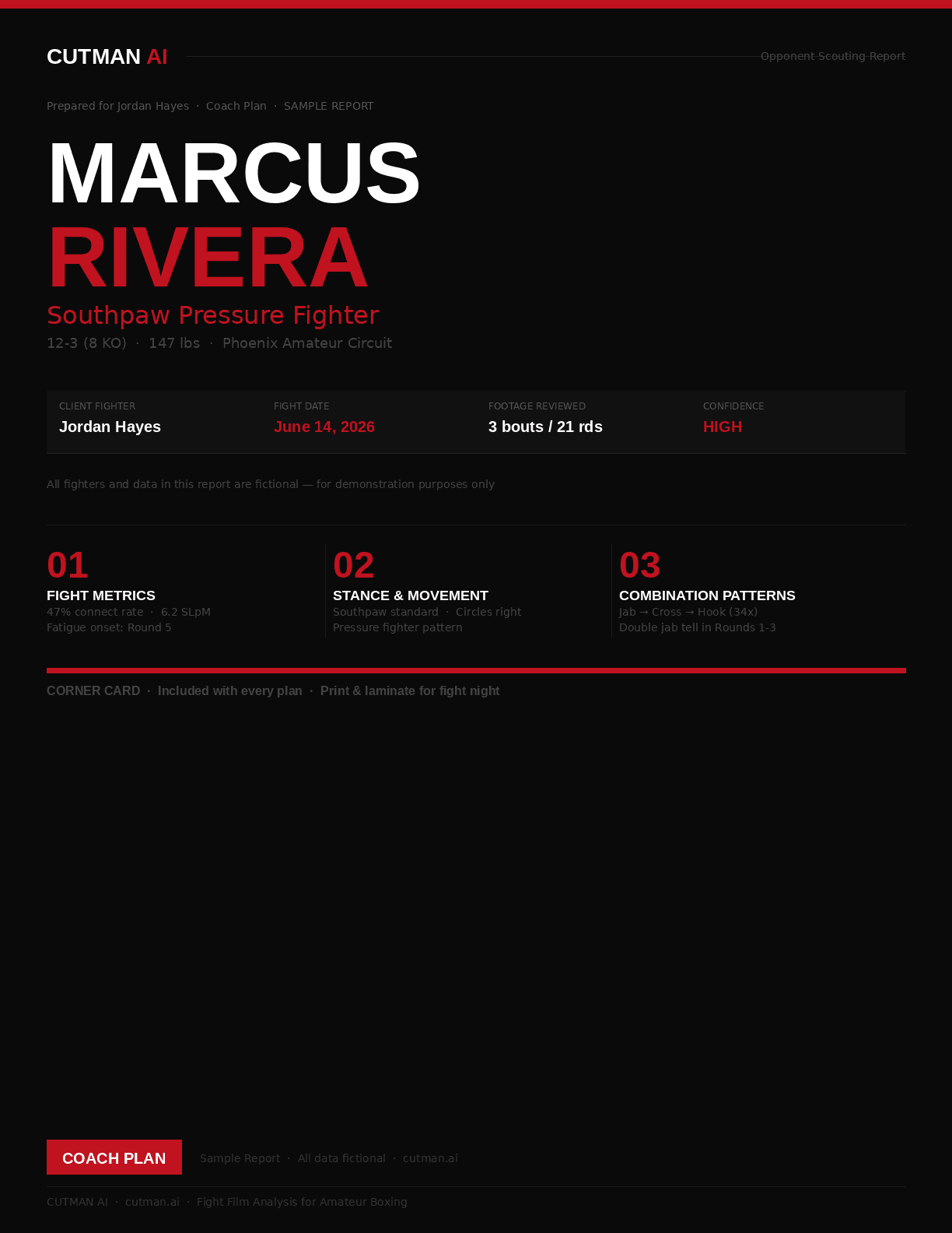 First analyses underway. Request yours and receive delivery within 48 hours. Full reports include stance tendencies, combination patterns, defensive gaps, fatigue timeline by round, reaction pattern map, and a complete round-by-round gameplan. Delivered as a clean PDF or Google Doc.